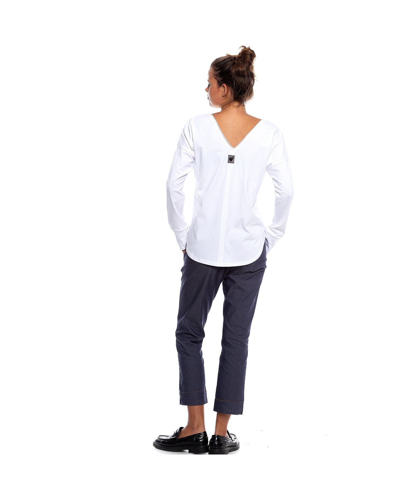 ISA to nietuzinkowy projekt z literą V z przodu oraz z tyłu. Po środku przodu i tyłu ozdobny szew, zaokrąglone doły i przedłużone rękawy doszywanym mankietem. Miękka dzianina bawełniana idealnie układająca się do sylwetki. POLECAMY!