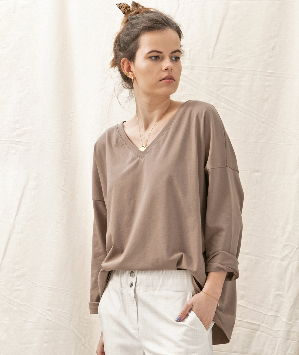 Bluzka-bluza wykonana z wysokogatunkowej dzianiny bawełnianej. Karczek i marszczenia na tyle, wydłużony tył. Rękawy luźne, dekolt V. Fason uniwersalny, dopasujesz do wszystkiego. Model oversize, lużna forma, casualowy luz. Must have!