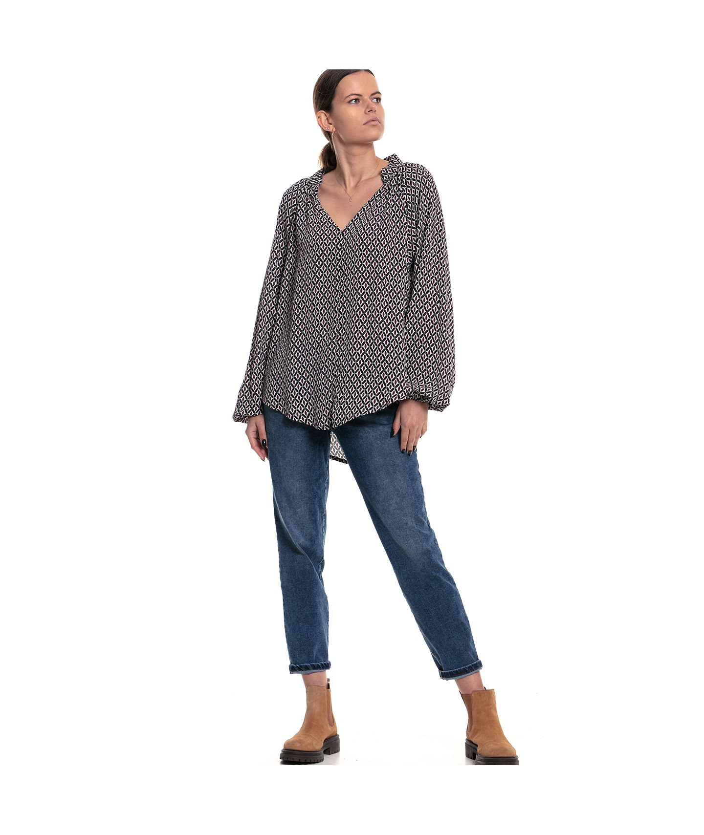 Bluzka wykonana z tkaniny wiskozowej w piękny, geometryczny print. Reglanowy rękaw, stójka i marszczenia przy dekolcie tworzą projekt wyjątkowo "lekki" i oryginalny. Dolna część rękawów obficie marszczona, zaokrąglone doły. Świetnie sprawdzi się w stylizacji eleganckiej jak i sportowej. Lekka tkanina wiskozowa o żorżetowym chwycie.