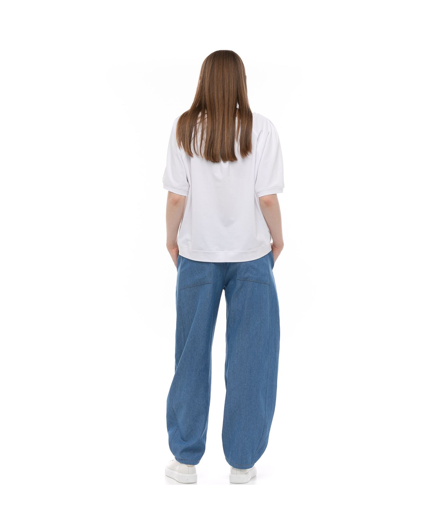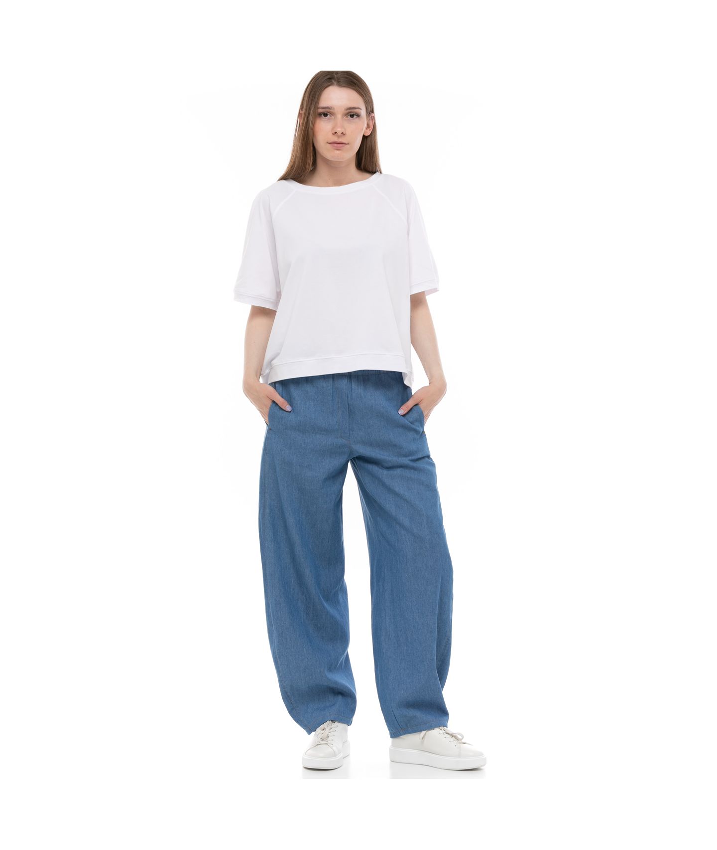 Bluzka wykonana z wysokiej jakości dzianiny bawełnianej z dodatkiem elastanu o świetnie skrojonym reglanowym fasonie. Okrągły, luźny dekolt o lekko wydłóżonym łodkowym kształcie. Wykończenie dołu i rękawów nadaje świerzego, lekko sportowego charakteru. Nieduża kontrafałda na tyle.
