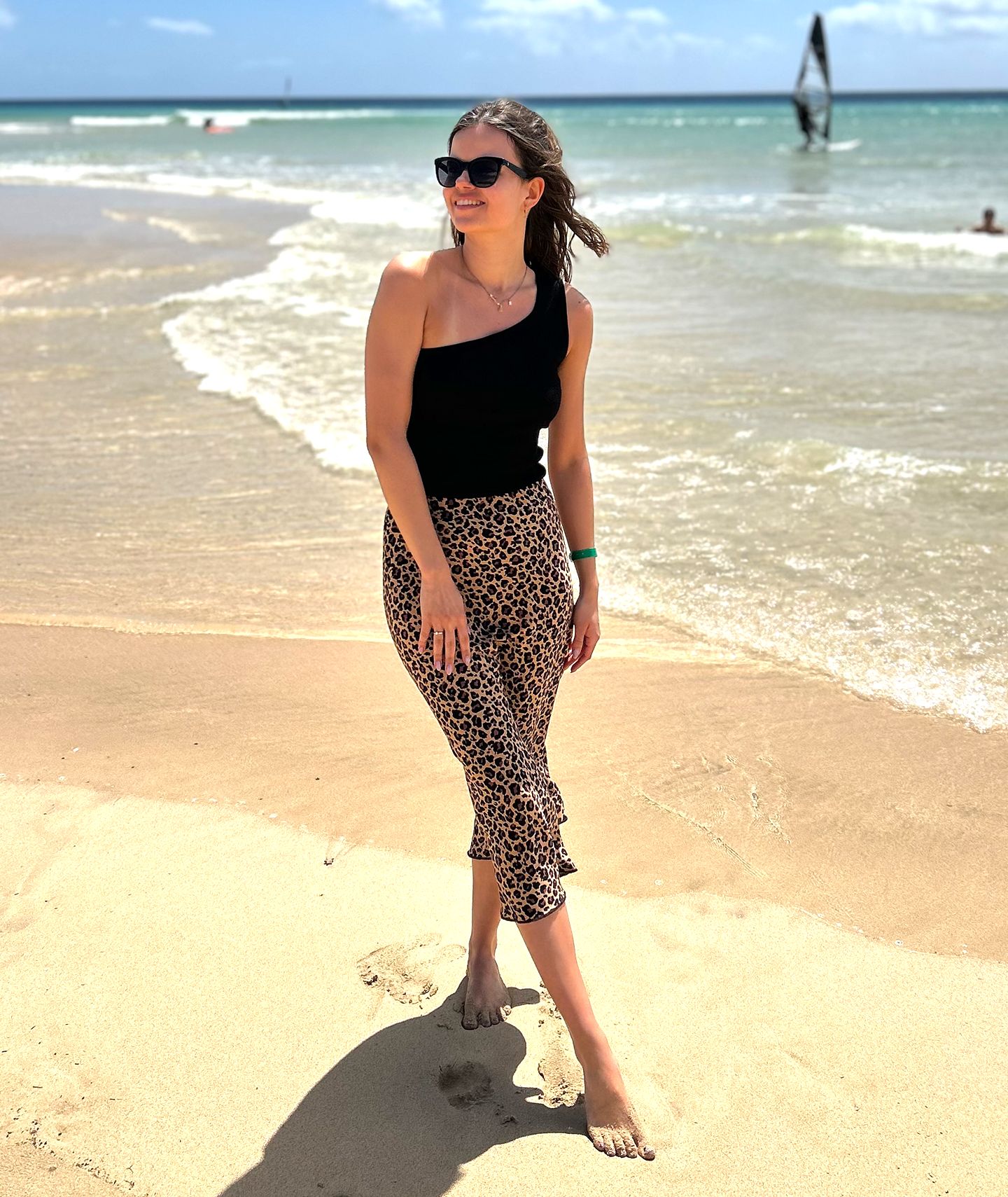 Spódnica skrojona ze skosu co powoduje wyjątkowe dopasowanie tkaniny do sylwetki, wykonana z wysokogatunkowej tkaniny wiskozowej w piękny i bardzo aktualny obecnie zwierzęcy print. Świetnie komponuje się z elegancką bluzką, klasycznym t-shirtem jak i obszernym swetrem lub bluzą. Jak zwykle u nas: do eleganckiego obuwia lub wygodnych trampek. W pasie guma, dół wykończony mereżką.