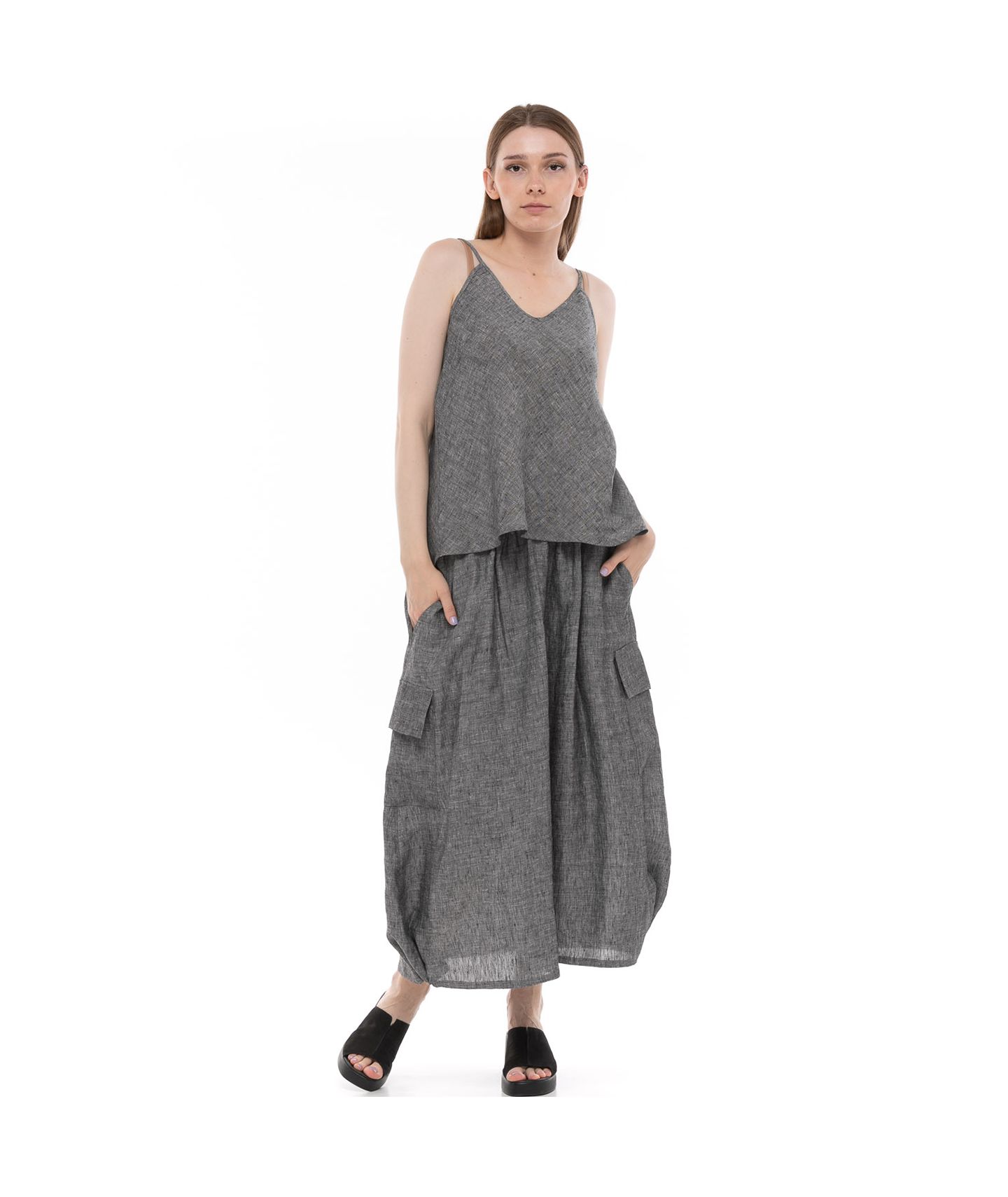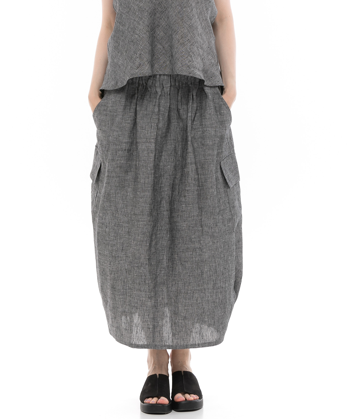 Luźna, długa, lniana spódnica w kolorze szarego melanżu. Kieszenie typu cargo po bokach i komfortowa guma w pasie. Na dole, po bokach napy pozwalające na zmianę kształtu, po zapięciu otrzymujemy fantastyczny kształt bombki.