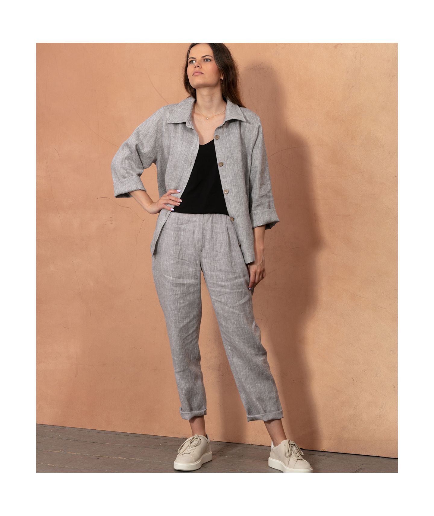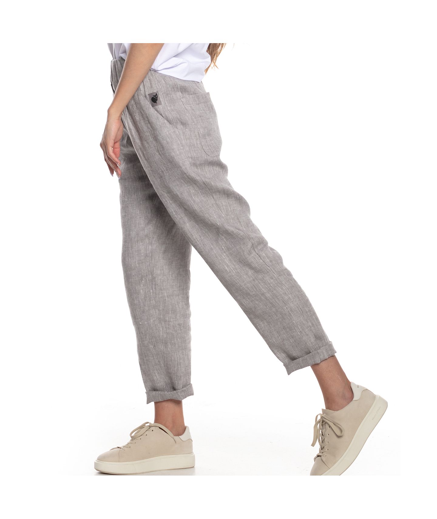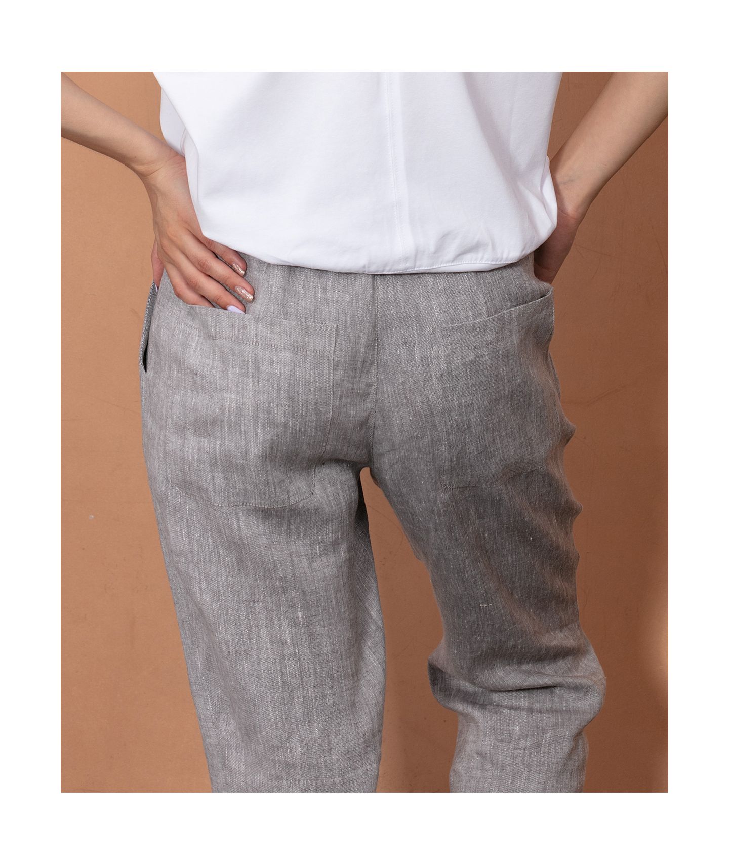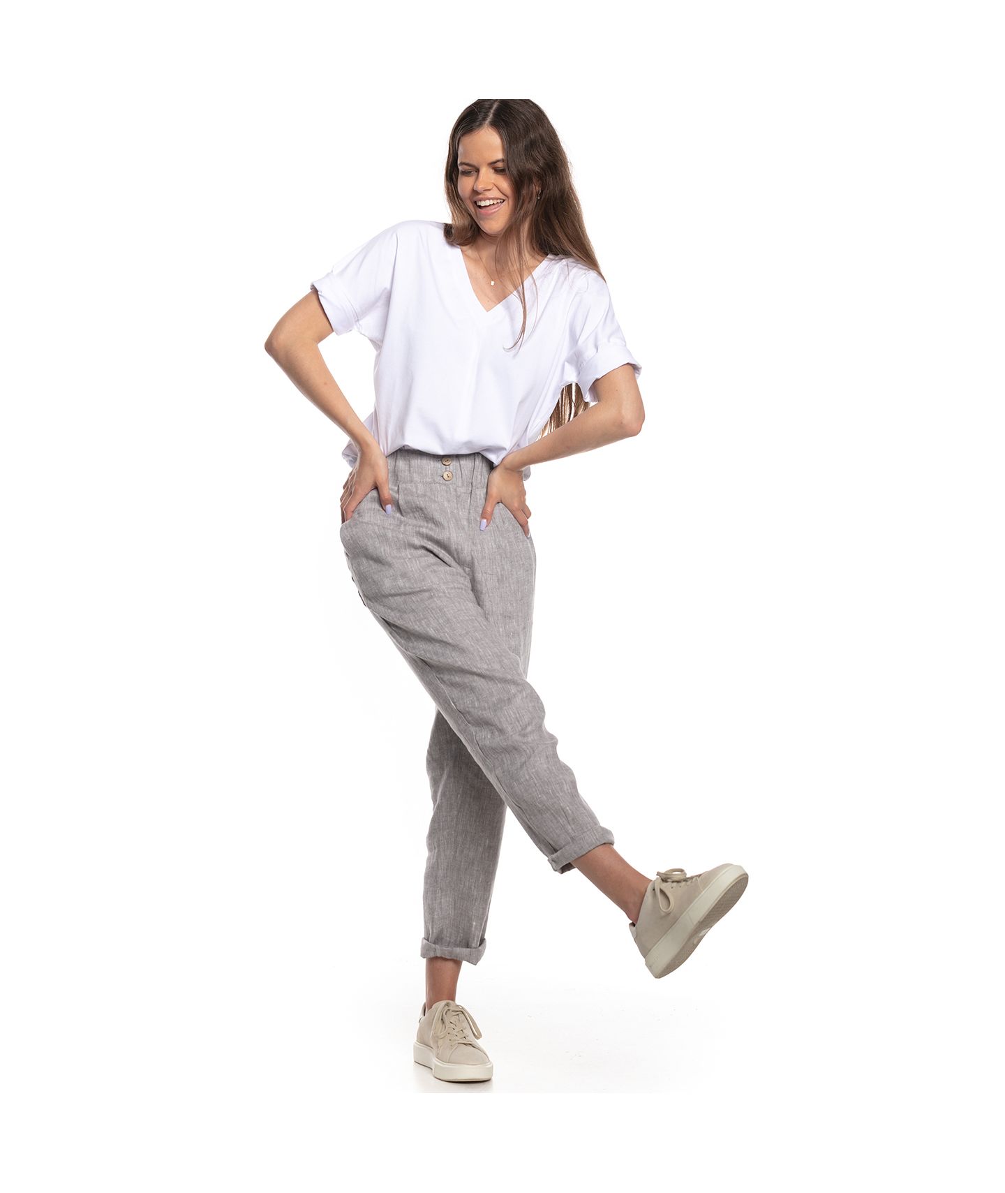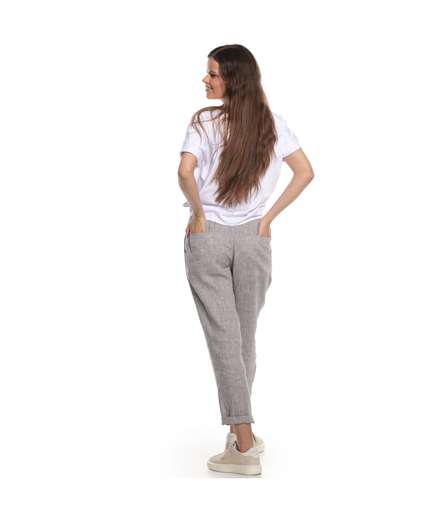 Spodnie o ponadczasowym, luźnym kroju wykonane z tkaniny lnianej o fantastycznym melanżowym splocie. W pasie zapinane na guziki i zamek YKK, guma w pasku ułatwia dopasowanie rozmiaru. Klasyczne kieszenie skośne po bokach oraz dwie kieszenie naszyte na tyle.