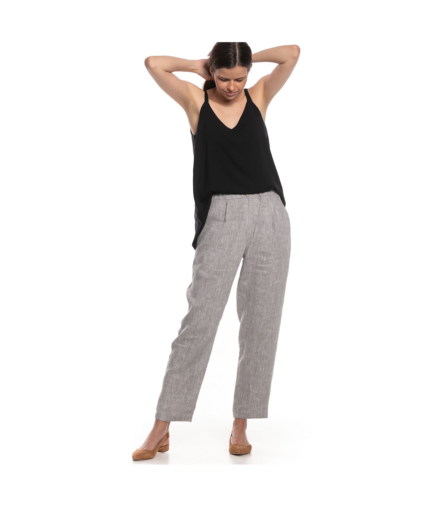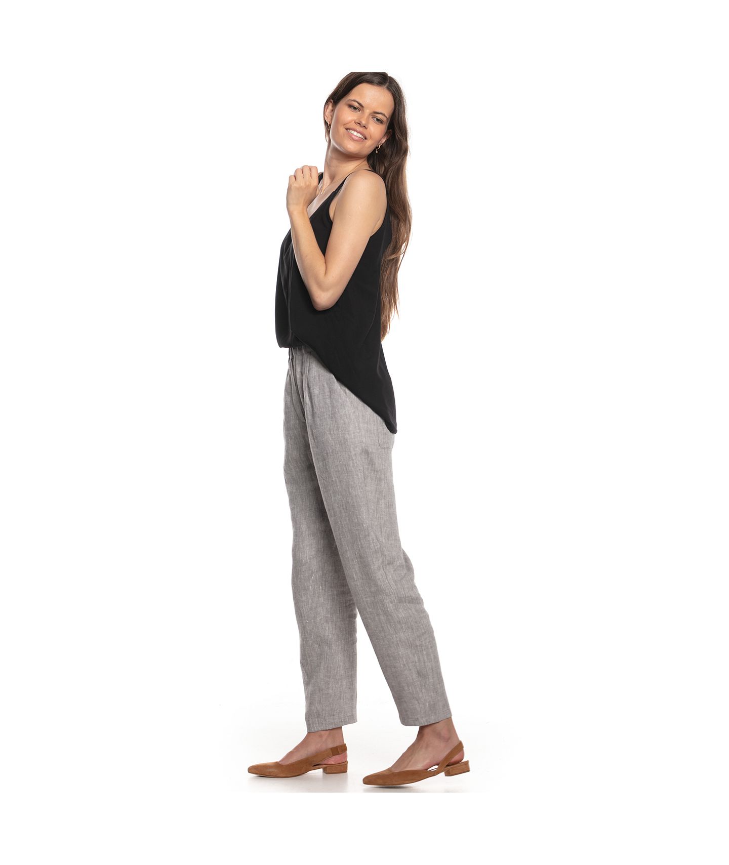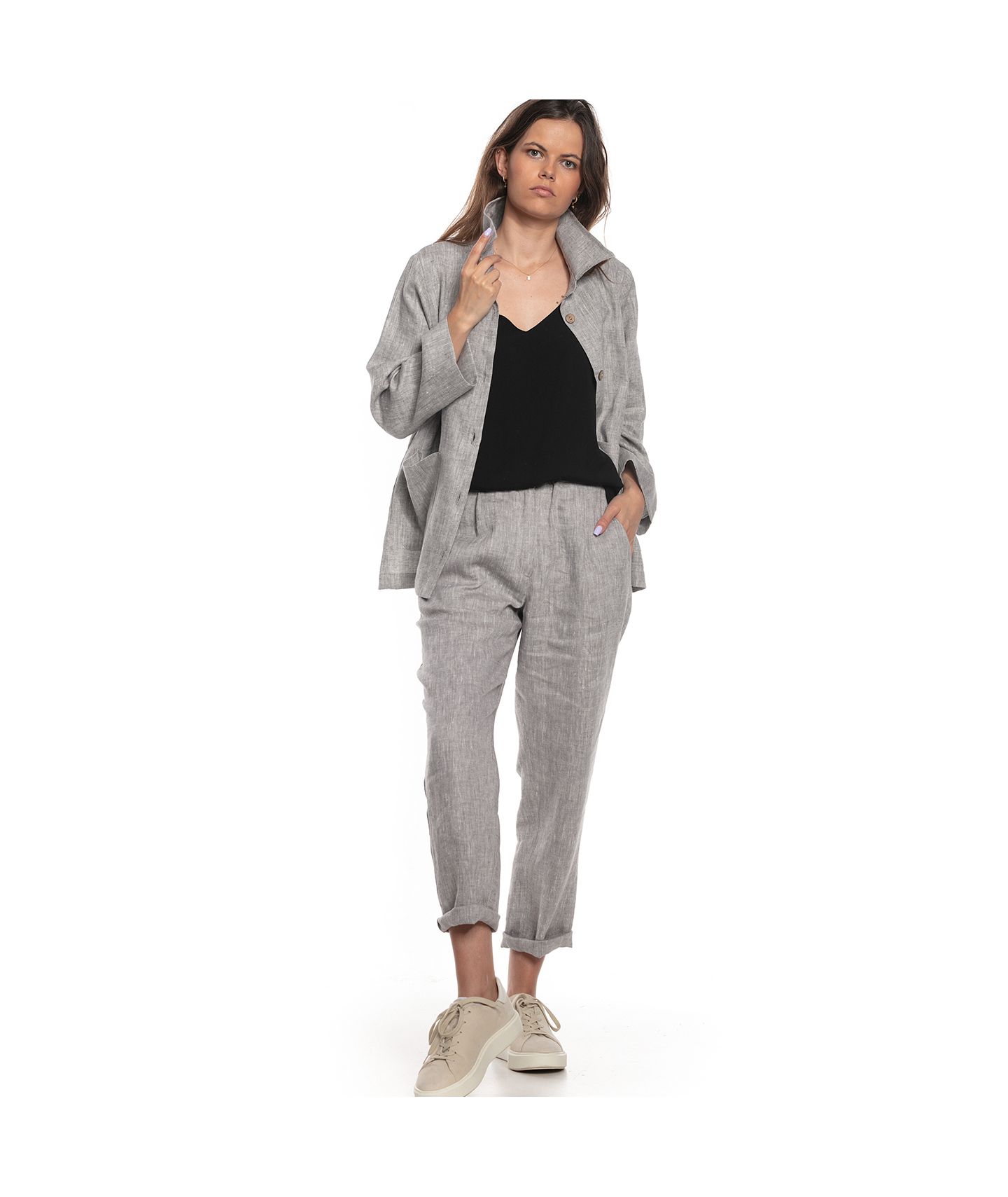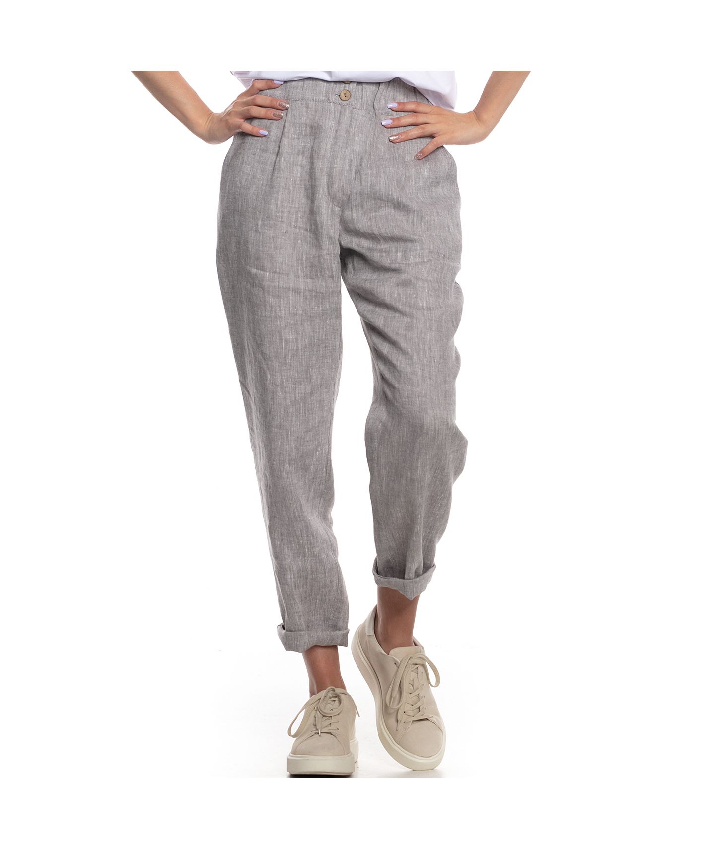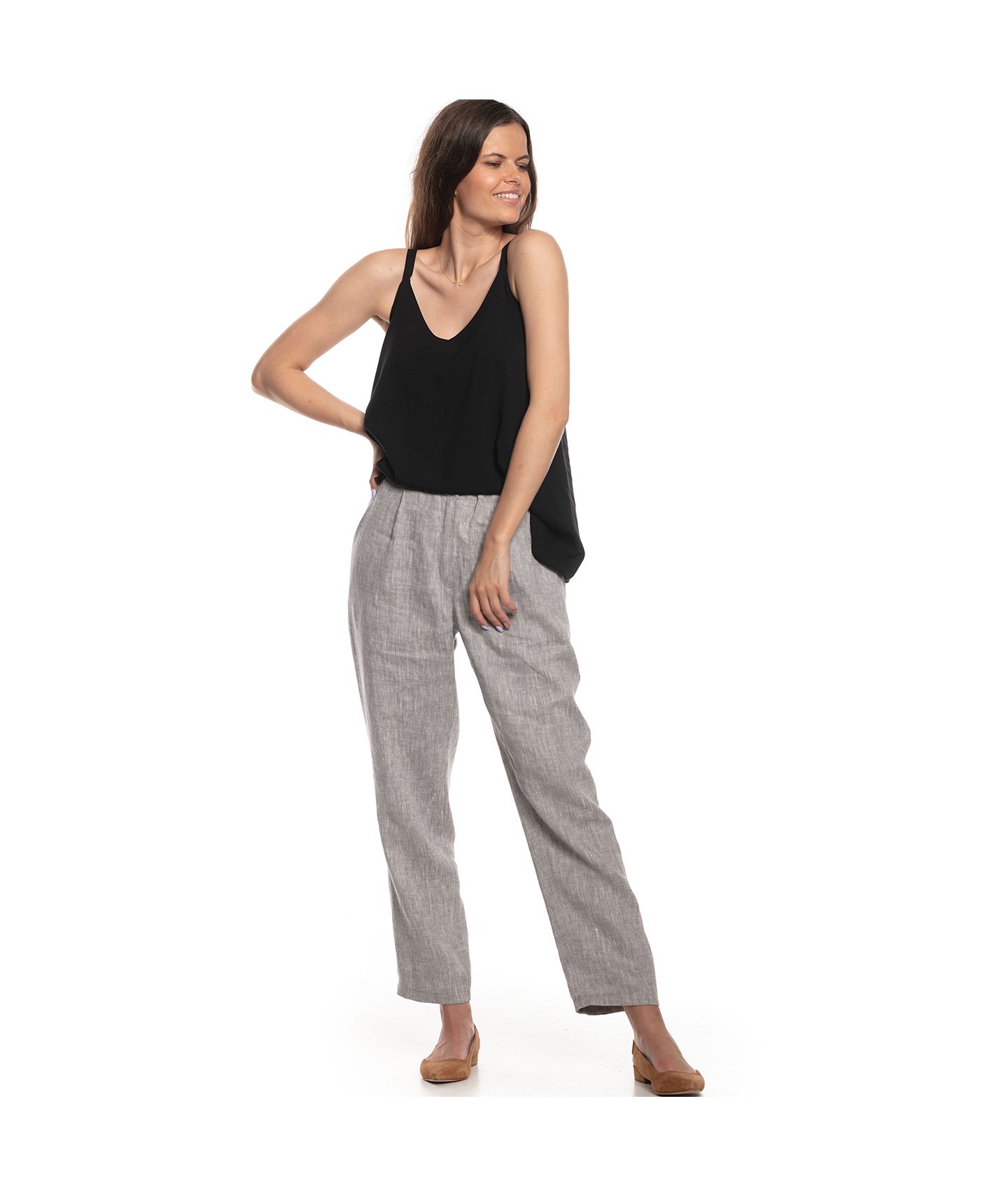 Spodnie o ponadczasowym, luźnym kroju wykonane z tkaniny lnianej o fantastycznym melanżowym splocie. W pasie zapinane na guziki i zamek YKK, guma w pasku ułatwia dopasowanie rozmiaru. Klasyczne kieszenie skośne po bokach oraz dwie kieszenie naszyte na tyle.