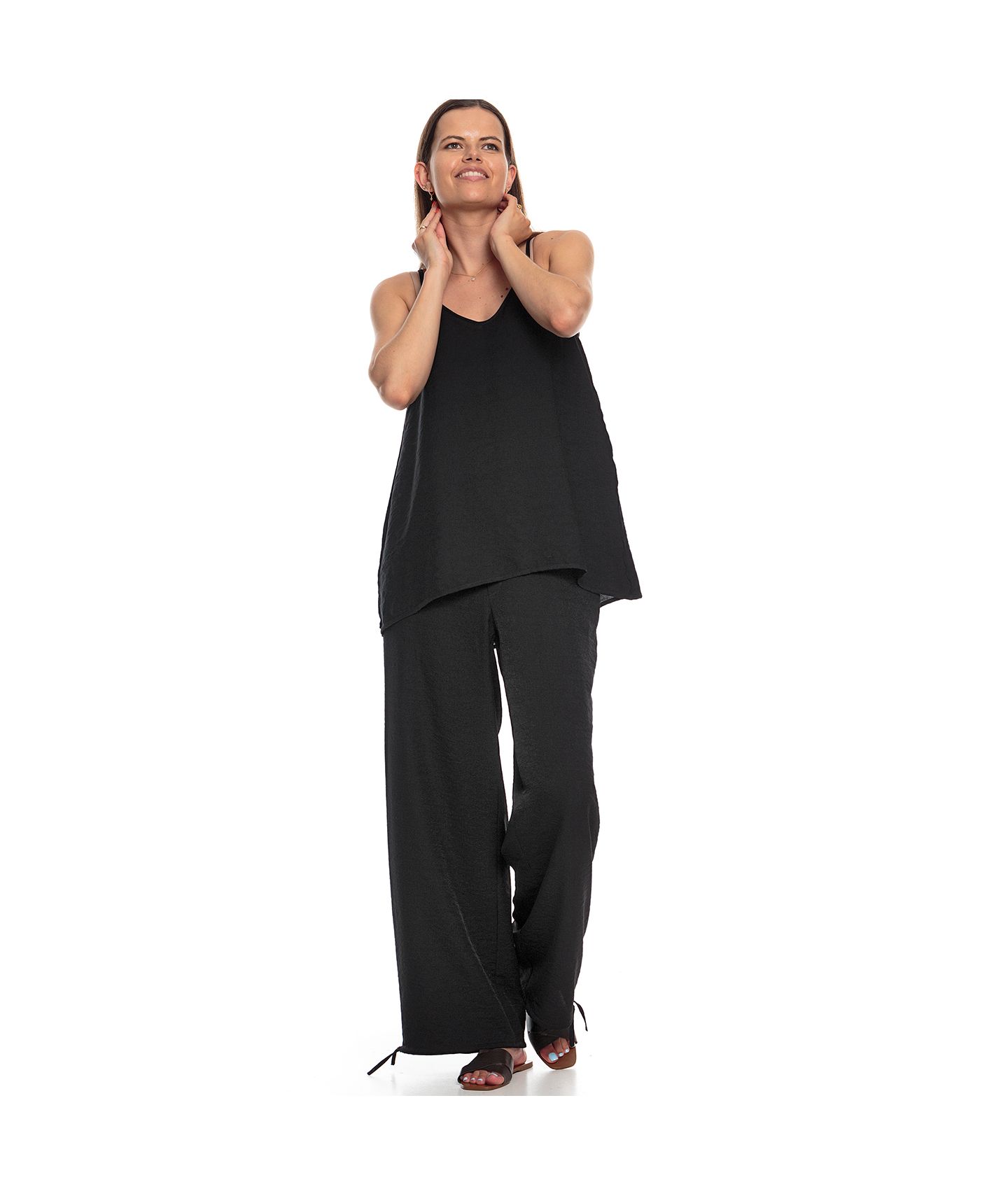 INDY to lużne, szerokie nogawki z możliwością ściągnięcia troczkami na dole, wykonane z lekkiej kreszowanej tkaniny wiskozowej. Kieszenie skośne po bokach, w pasie guma i przeszycie imitujące zapięcie suwaka z przodu. Z tyłu naszyte dwie kieszenie. Fason niezwykle aktualny w obecnym sezonie. Do noszenia zupełnie luźno lub ściągnięcia na dole i ułożenia na dowolnej wysokości.
