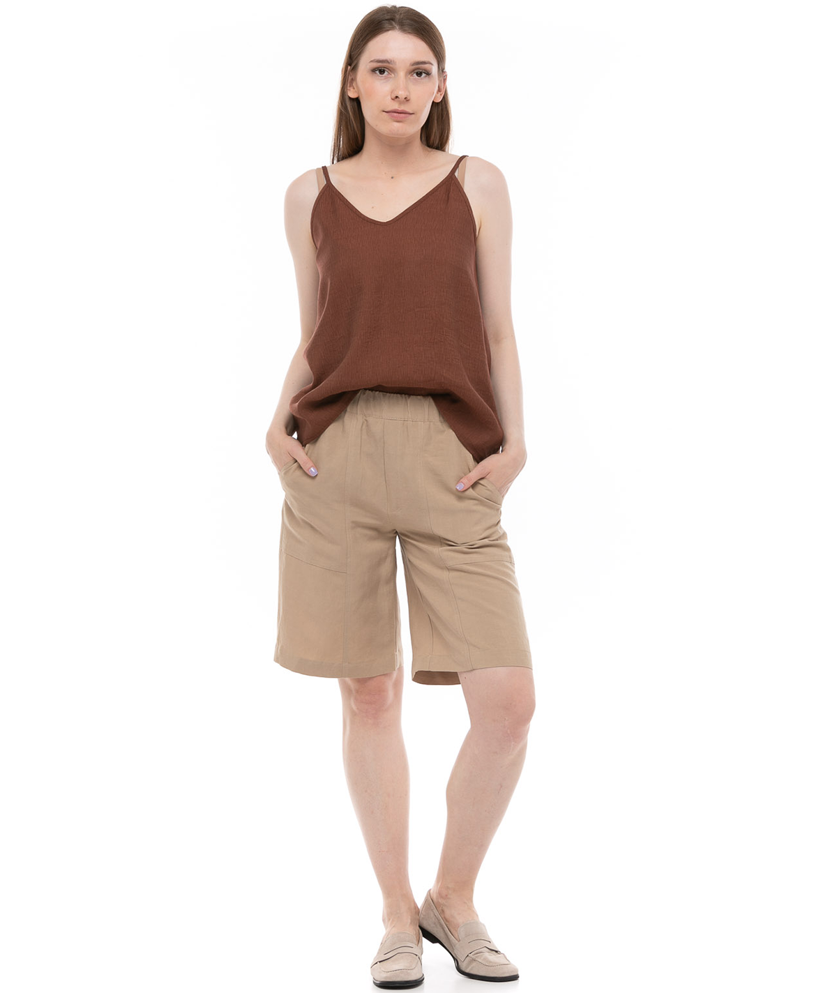 Lido to luźne, swobodne szorty wykonane z przewiewnej tkaniny - mieszanki lnu i wiskozy. Z przodu naszyte kieszenie typu "worker", w pasie guma i przeszycie imitujące zapięcie suwaka z przodu. Z tyłu naszyta kieszeń.