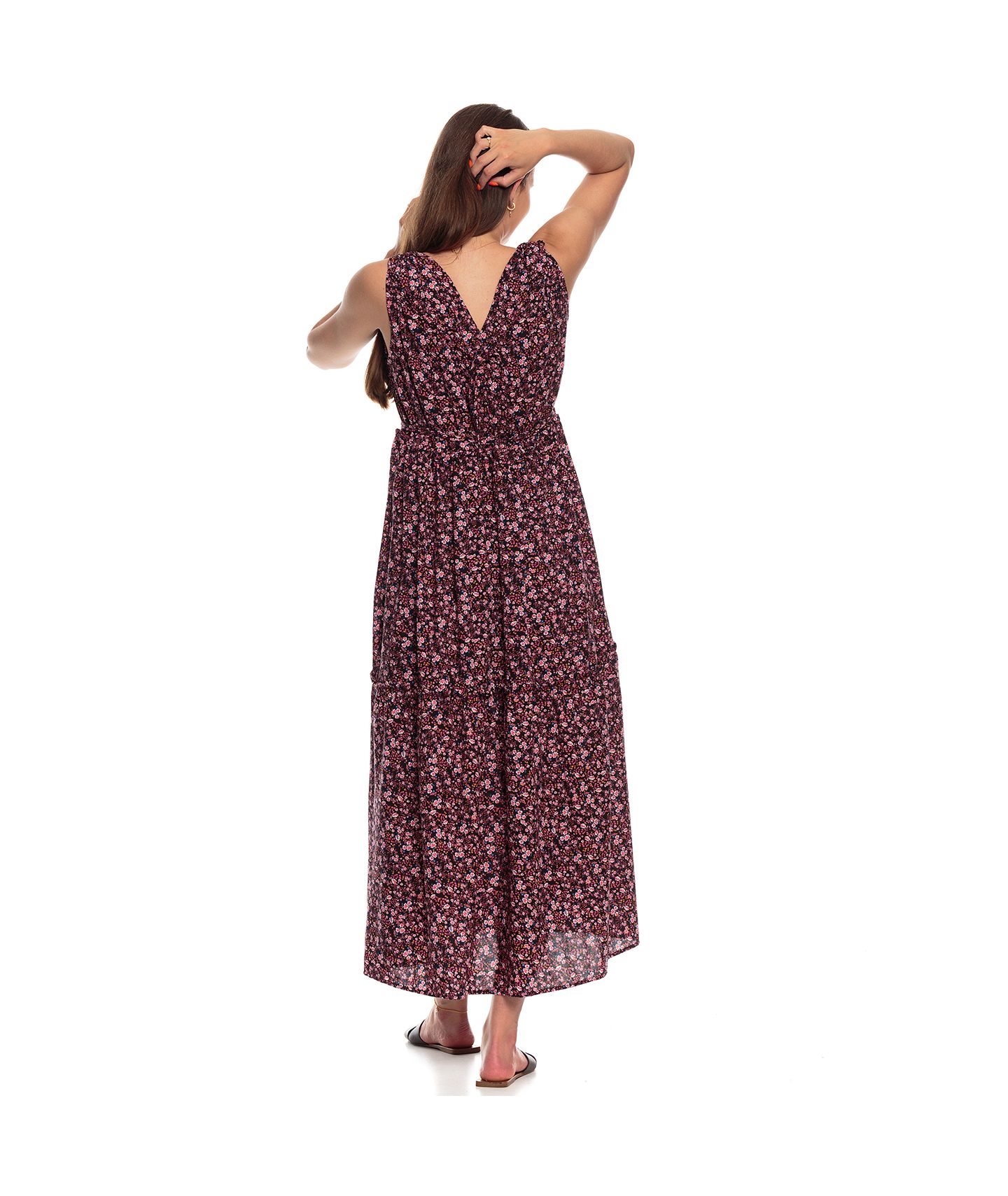 Sukienka - kameleon. Regulacja ramion pozwala na ich zasłonięcie tworząc bardziej formalne wrażenie lub ściągnięcie tak, aby były całkowicie odsłonięte z efektem marszczenia, nadając typowo letni i wakacyjny wygląd. Dwie marszczone falbany oraz kieszenie w szwach bocznych. Do noszenia z paskiem lub bez - zupełnie "luźno". Piękna kolorystyka - odcienie różu i bordo.