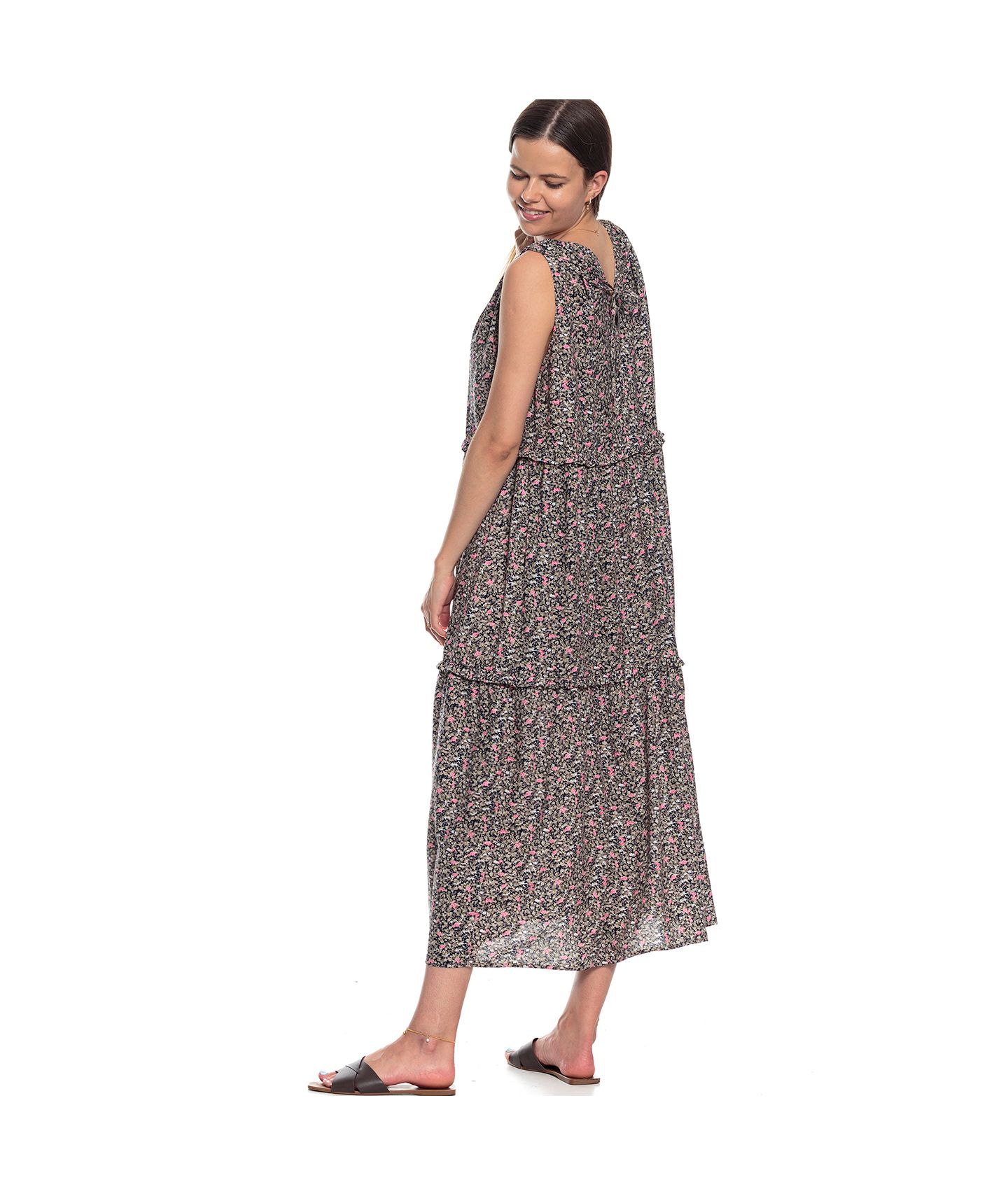 Sukienka - kameleon. Regulacja ramion pozwala na ich zasłonięcie tworząc bardziej formalne wrażenie lub ściągnięcie tak, aby były całkowicie odsłonięte z efektem marszczenia, nadając typowo letni i wakacyjny wygląd. Dwie marszczone falbany oraz kieszenie w szwach bocznych. Do noszenia z paskiem lub bez - zupełnie "luźno". Piękna, szarość z drobinkami różu.